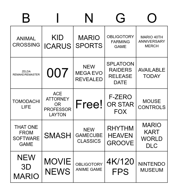 This bingo card has a free space and 24 words: SMASH, MOVIE NEWS, NEW MEGA EVO REVEALED, NEW 3D MARIO, MARIO 40TH ANNIVERSARY MERCH, ANIMAL CROSSING, ZELDA REMAKE/REMASTER, KID ICARUS, F-ZERO OR STAR FOX, NEW GAMECUBE CLASSICS, SPLATOON RAIDERS RELEASE DATE, TOMODACHI LIFE, RHYTHM HEAVEN GROOVE, MARIO KART WORLD DLC, 007, 4K/120 FPS, MOUSE CONTROLS, MARIO SPORTS, AVAILABLE TODAY, ACE ATTORNEY OR PROFESSOR LAYTON, NINTENDO MUSEUM, THAT ONE FROM SOFTWARE GAME, OBLIGOTORY FARMING GAME and OBLIGOTORY ANIME GAME.