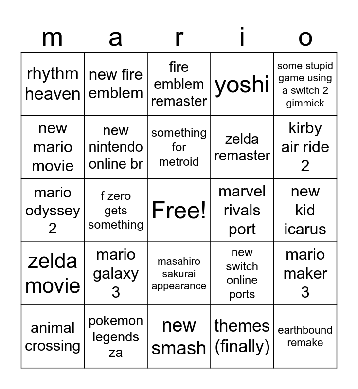 This bingo card has a free space and 24 words: mario galaxy 3, pokemon legends za, something for metroid, animal crossing, some stupid game using a switch 2 gimmick, rhythm heaven, new mario movie, new fire emblem, marvel rivals port, masahiro sakurai appearance, zelda remaster, mario odyssey 2, new switch online ports, mario maker 3, new nintendo online br, themes (finally), new kid icarus, fire emblem remaster, kirby air ride 2, f zero gets something, earthbound remake, zelda movie, yoshi and new smash.