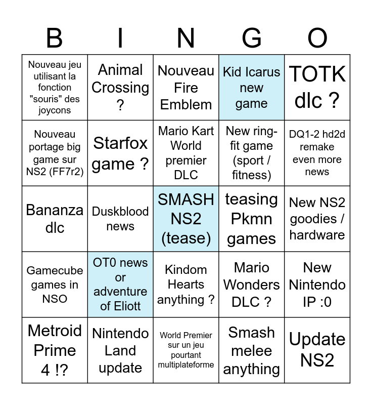 This bingo card has a free space and 24 words: OT0 news or adventure of Eliott, Nintendo Land update, Mario Kart World premier DLC, Metroid Prime 4 !?, TOTK dlc ?, Nouveau jeu utilisant la fonction "souris" des joycons, Nouveau portage big game sur NS2 (FF7r2), Animal Crossing ?, teasing Pkmn games, Kindom Hearts anything ?, New ring-fit game (sport / fitness), Bananza dlc, Mario Wonders DLC ?, New Nintendo IP :0, Starfox game ?, Smash melee anything, New NS2 goodies / hardware, Nouveau Fire Emblem, DQ1-2 hd2d remake even more news, Duskblood news, Update NS2, Gamecube games in NSO, Kid Icarus new game and World Premier sur un jeu pourtant multiplateforme.