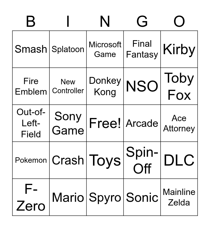 This bingo card has a free space and 24 words: Crash, Mario, Donkey Kong, F-Zero, Kirby, Smash, Fire Emblem, Splatoon, Arcade, Toys, NSO, Out-of-Left-Field, Spin-Off, DLC, New Controller, Sonic, Ace Attorney, Microsoft Game, Toby Fox, Sony Game, Mainline Zelda, Pokemon, Final Fantasy and Spyro.