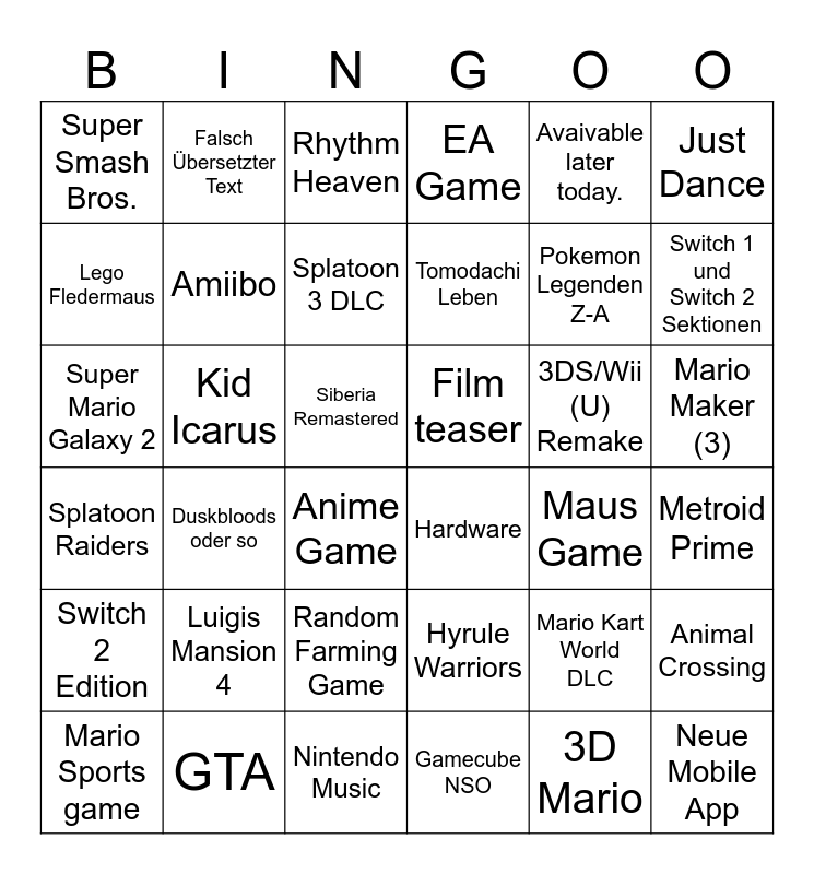 This bingo card has 36 words: Hyrule Warriors, Random Farming Game, Gamecube NSO, Lego Fledermaus, Splatoon Raiders, Film teaser, Amiibo, Nintendo Music, Avaivable later today., Mario Kart World DLC, Switch 1 und Switch 2 Sektionen, EA Game, Animal Crossing, Kid Icarus, Tomodachi Leben, Super Smash Bros., Switch 2 Edition, 3DS/Wii (U) Remake, Super Mario Galaxy 2, Rhythm Heaven, Siberia Remastered, Duskbloods oder so, Hardware, Anime Game, Maus Game, Falsch Übersetzter Text, Pokemon Legenden Z-A, GTA, Splatoon 3 DLC, Just Dance, Neue Mobile App, Mario Sports game, Metroid Prime, Mario Maker (3), Luigis Mansion 4 and 3D Mario.
