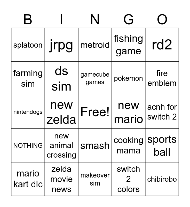 This bingo card has a free space and 24 words: new animal crossing, zelda movie news, gamecube games, mario kart dlc, rd2, splatoon, farming sim, jrpg, new mario, smash, pokemon, nintendogs, cooking mama, sports ball, ds sim, switch 2 colors, acnh for switch 2, metroid, fire emblem, new zelda, chibirobo, NOTHING, fishing game and makeover sim.