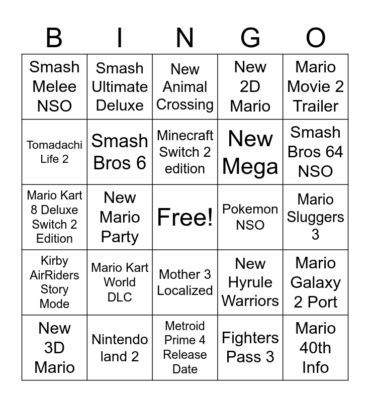 This bingo card has a free space and 24 words: Mario Kart World DLC, Nintendo land 2, Minecraft Switch 2 edition, New 3D Mario, Mario Movie 2 Trailer, Smash Melee NSO, Tomadachi Life 2, Smash Ultimate Deluxe, Pokemon NSO, Mother 3 Localized, New Mega, Mario Kart 8 Deluxe Switch 2 Edition, New Hyrule Warriors, Mario Galaxy 2 Port, Smash Bros 6, Fighters Pass 3, Mario Sluggers 3, New Animal Crossing, Smash Bros 64 NSO, New Mario Party, Mario 40th Info, Kirby AirRiders Story Mode, New 2D Mario and Metroid Prime 4 Release Date.