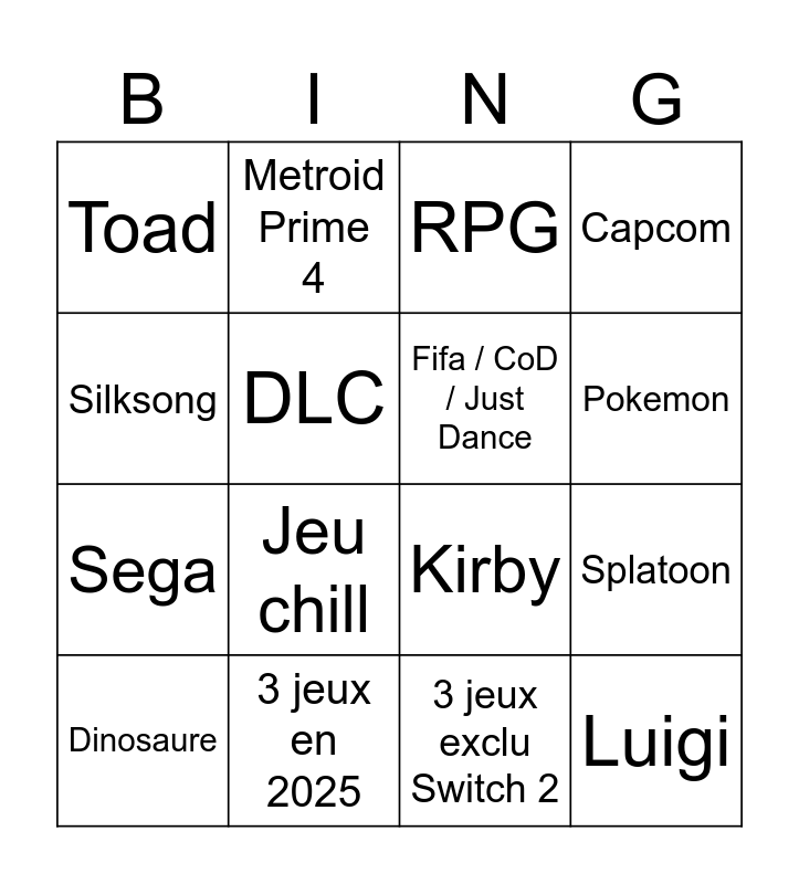 This bingo card has 16 words: 3 jeux en 2025, Splatoon, RPG, Toad, Sega, Metroid Prime 4, Kirby, 3 jeux exclu Switch 2, Silksong, DLC, Dinosaure, Capcom, Jeu chill, Pokemon, Fifa / CoD / Just Dance and Luigi.