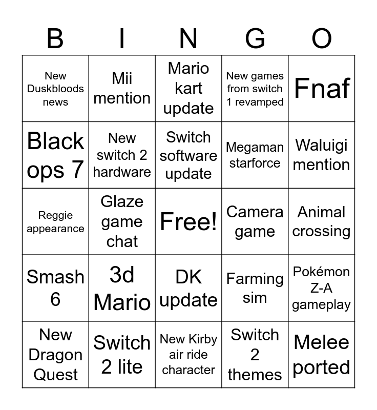 This bingo card has a free space and 24 words: 3d Mario, Switch 2 lite, Switch software update, New Dragon Quest, Fnaf, New Duskbloods news, Black ops 7, Mii mention, Camera game, DK update, Megaman starforce, Reggie appearance, Farming sim, Pokémon Z-A gameplay, New switch 2 hardware, Switch 2 themes, Animal crossing, Mario kart update, Waluigi mention, Glaze game chat, Melee ported, Smash 6, New games from switch 1 revamped and New Kirby air ride character.