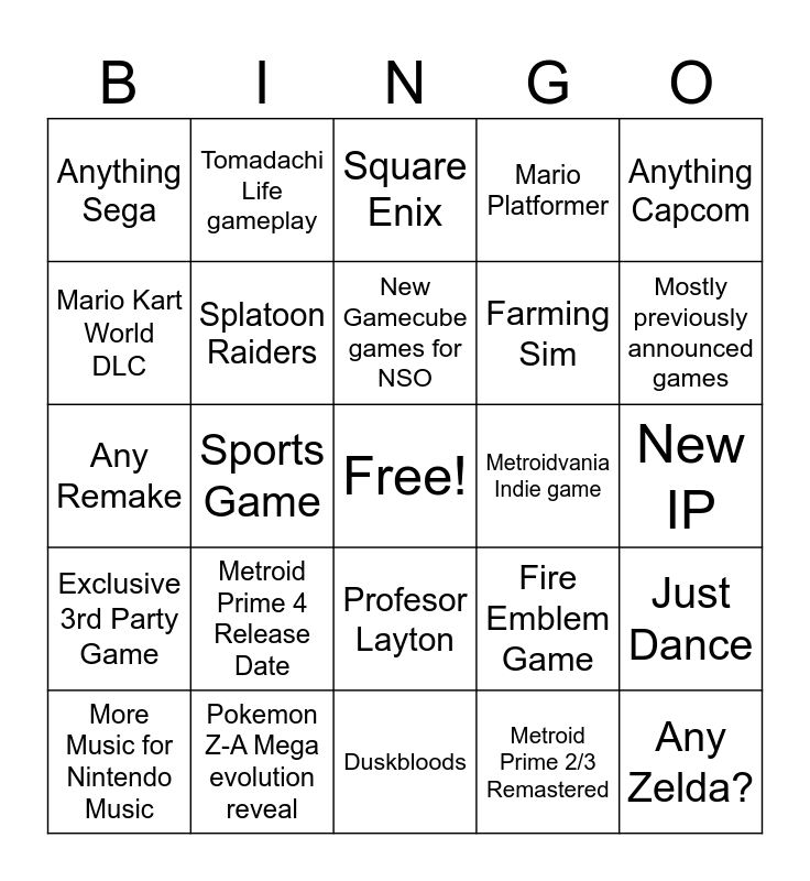 This bingo card has a free space and 24 words: Metroid Prime 4 Release Date, Pokemon Z-A Mega evolution reveal, New Gamecube games for NSO, More Music for Nintendo Music, Anything Capcom, Anything Sega, Mario Kart World DLC, Tomadachi Life gameplay, Metroidvania Indie game, Profesor Layton, Farming Sim, Any Remake, Fire Emblem Game, Just Dance, Splatoon Raiders, Metroid Prime 2/3 Remastered, New IP, Square Enix, Mostly previously announced games, Sports Game, Any Zelda?, Exclusive 3rd Party Game, Mario Platformer and Duskbloods.