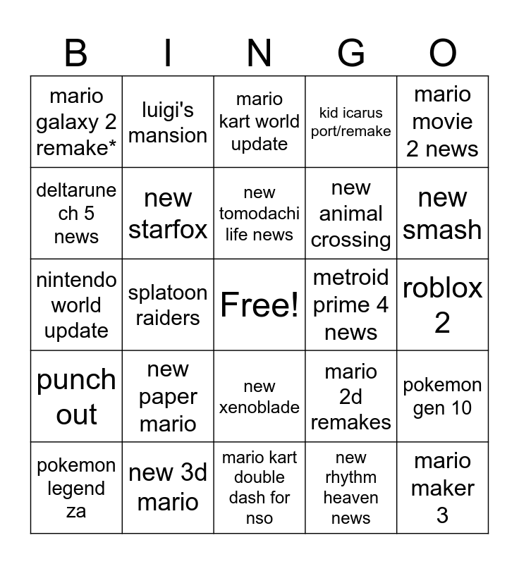 This bingo card has a free space and 24 words: new paper mario, new 3d mario, new tomodachi life news, pokemon legend za, mario movie 2 news, mario galaxy 2 remake*, deltarune ch 5 news, luigi's mansion, metroid prime 4 news, new xenoblade, new animal crossing, nintendo world update, mario 2d remakes, pokemon gen 10, new starfox, new rhythm heaven news, roblox 2, mario kart world update, new smash, splatoon raiders, mario maker 3, punch out, kid icarus port/remake and mario kart double dash for nso.