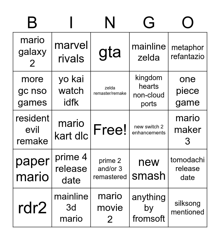 This bingo card has a free space and 24 words: prime 4 release date, mainline 3d mario, zelda remaster/remake, rdr2, metaphor refantazio, mario galaxy 2, more gc nso games, marvel rivals, new switch 2 enhancements, prime 2 and/or 3 remastered, kingdom hearts non-cloud ports, resident evil remake, new smash, tomodachi release date, yo kai watch idfk, anything by fromsoft, mario maker 3, gta, one piece game, mario kart dlc, silksong mentioned, paper mario, mainline zelda and mario movie 2.