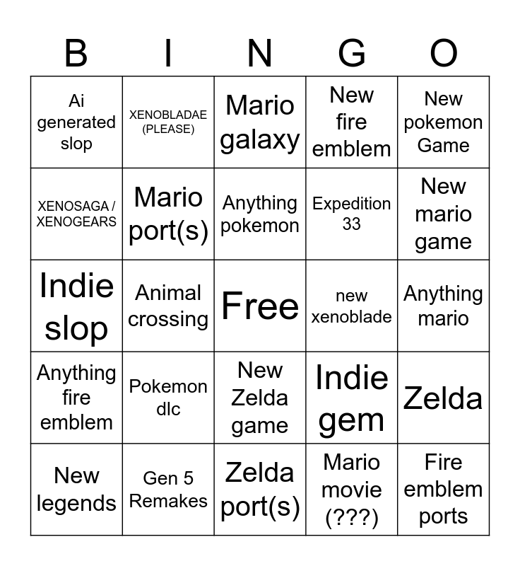 This bingo card has a free space and 24 words: Pokemon dlc, Gen 5 Remakes, Anything pokemon, New legends, New pokemon Game, Ai generated slop, XENOSAGA / XENOGEARS, XENOBLADAE (PLEASE), new xenoblade, New Zelda game, Expedition 33, Indie slop, Indie gem, Zelda, Mario port(s), Mario movie (???), Anything mario, Mario galaxy, New mario game, Animal crossing, Fire emblem ports, Anything fire emblem, New fire emblem and Zelda port(s).