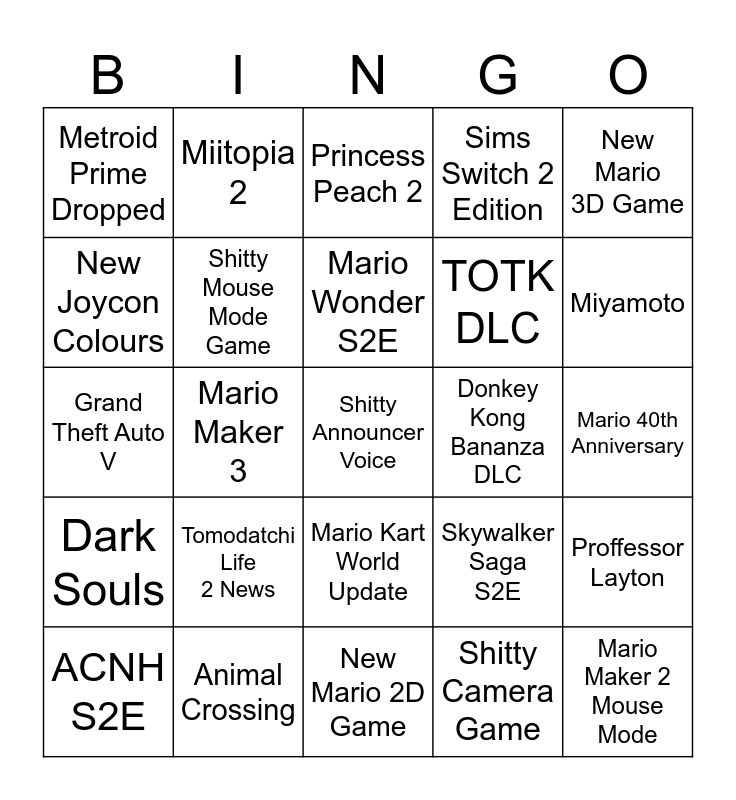 This bingo card has a free space and 24 words: Tomodatchi Life 2 News, Animal Crossing, Mario Wonder S2E, ACNH S2E, New Mario 3D Game, Metroid Prime Dropped, New Joycon Colours, Miitopia 2, Donkey Kong Bananza DLC, Mario Kart World Update, TOTK DLC, Grand Theft Auto V, Skywalker Saga S2E, Proffessor Layton, Shitty Mouse Mode Game, Shitty Camera Game, Mario 40th Anniversary, Princess Peach 2, Miyamoto, Mario Maker 3, Mario Maker 2 Mouse Mode, Dark Souls, Sims Switch 2 Edition and New Mario 2D Game.