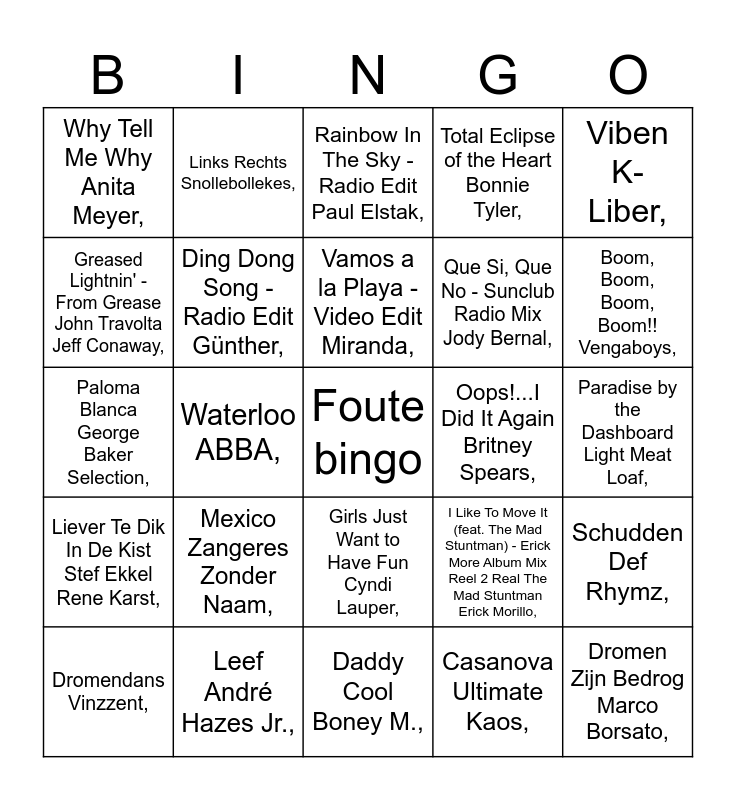This bingo card has a free space and 45 words: Ich bin wie du Marianne Rosenberg,, Dromen Zijn Bedrog Marco Borsato,, Ademnood Linda Roos & Jessica,, Dromendans Vinzzent,, Dragostea Din Tei - Original Italian Version O-Zone,, Casanova Ultimate Kaos,, Rainbow In The Sky - Radio Edit Paul Elstak,, Captain Jack - Short Mix Captain Jack,, Viben K-Liber,, Leef André Hazes Jr.,, Total Eclipse of the Heart Bonnie Tyler,, Oops!...I Did It Again Britney Spears,, Girls Just Want to Have Fun Cyndi Lauper,, Mexico Zangeres Zonder Naam,, Uptown Girl - Radio Edit Westlife,, Daddy Cool Boney M.,, Funkytown Lipps Inc.,, Paloma Blanca George Baker Selection,, Bewegen is Gezond Kinderen voor Kinderen,, Boom, Boom, Boom, Boom!! Vengaboys,, Links Rechts Snollebollekes,, Love Me Just a Little Bit More (Totally Hooked on You) Dolly Dots,, 99 Luftballons Nena,, Why Tell Me Why Anita Meyer,, Rampeneren Ali B The Partysquad Yes-R,, Paradise by the Dashboard Light Meat Loaf,, YMCA - Original Version 1978 Village People,, Macarena - Bayside Boys Remix Los Del Rio,, I Like To Move It (feat. The Mad Stuntman) - Erick More Album Mix Reel 2 Real The Mad Stuntman Erick Morillo,, Liever Te Dik In De Kist Stef Ekkel Rene Karst,, Follow The Leader The Soca Boys Van B. King,, Schudden Def Rhymz,, Atje Voor De Sfeer Rene Karst,, Take on Me a-ha,, Anton aus Tirol DJ Ötzi,, Waterloo ABBA,, Eye of the Tiger Survivor,, Narcotic - Radio Edit Liquido,, La Bomba King Africa,, Vamos a la Playa - Video Edit Miranda,, Greased Lightnin' - From Grease John Travolta Jeff Conaway,, Que Si, Que No - Sunclub Radio Mix Jody Bernal,, Wake Me Up Before You Go-Go Wham!,, Ding Dong Song - Radio Edit Günther, and Heb Je Even Voor Mij Frans Bauer.