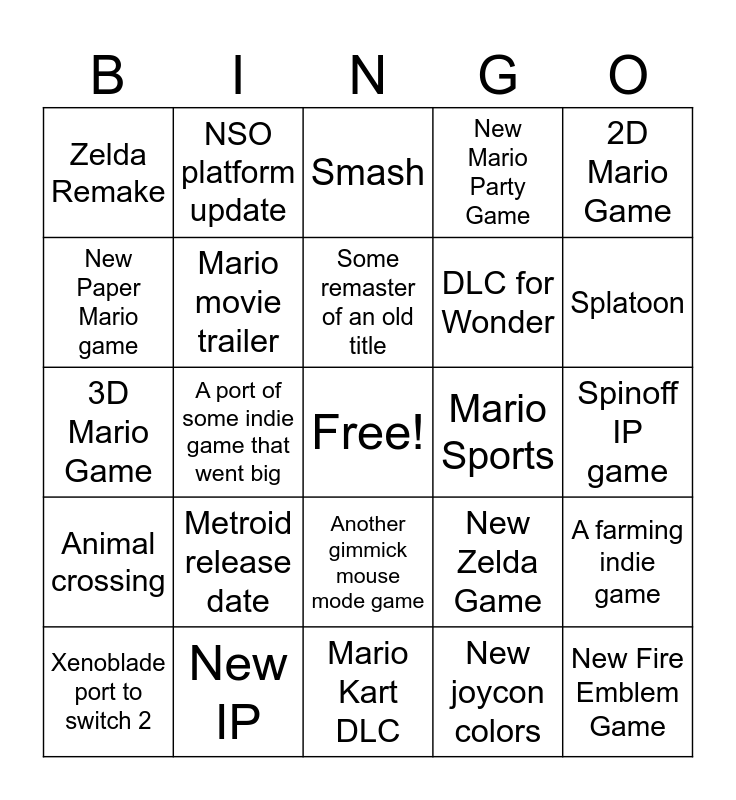 This bingo card has a free space and 24 words: Metroid release date, New IP, Some remaster of an old title, Xenoblade port to switch 2, 2D Mario Game, Zelda Remake, New Paper Mario game, NSO platform update, Mario Sports, Another gimmick mouse mode game, DLC for Wonder, 3D Mario Game, New Zelda Game, A farming indie game, Mario movie trailer, New joycon colors, Spinoff IP game, Smash, Splatoon, A port of some indie game that went big, New Fire Emblem Game, Animal crossing, New Mario Party Game and Mario Kart DLC.