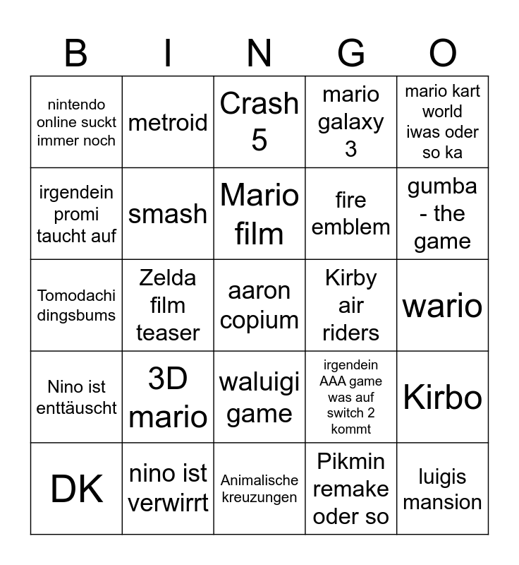 This bingo card has a free space and 24 words: 3D mario, nino ist verwirrt, Mario film, DK, mario kart world iwas oder so ka, nintendo online suckt immer noch, irgendein promi taucht auf, metroid, Kirby air riders, waluigi game, fire emblem, Tomodachi dingsbums, irgendein AAA game was auf switch 2 kommt, Kirbo, smash, Pikmin remake oder so, wario, Crash 5, gumba - the game, Zelda film teaser, luigis mansion, Nino ist enttäuscht, mario galaxy 3 and Animalische kreuzungen.