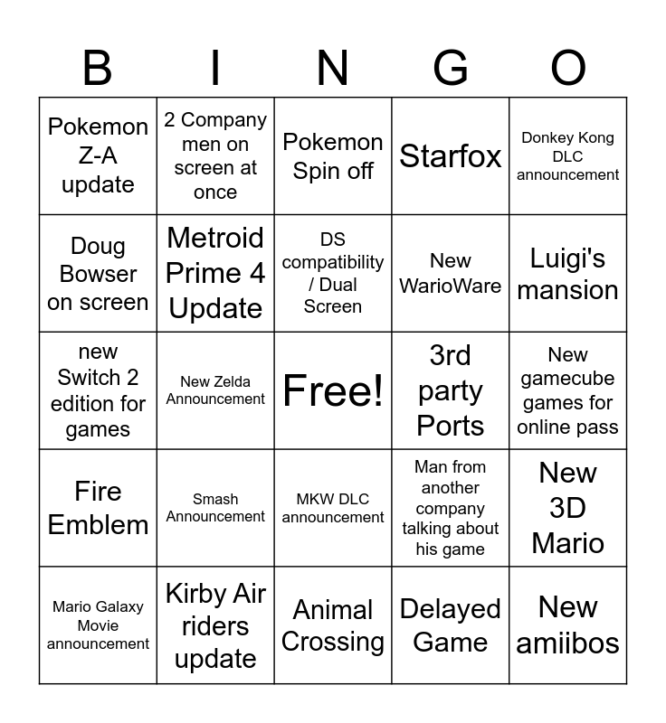 This bingo card has a free space and 24 words: Smash Announcement, Kirby Air riders update, DS compatibility / Dual Screen, Mario Galaxy Movie announcement, Donkey Kong DLC announcement, Pokemon Z-A update, Doug Bowser on screen, 2 Company men on screen at once, 3rd party Ports, MKW DLC announcement, New WarioWare, new Switch 2 edition for games, Man from another company talking about his game, New 3D Mario, Metroid Prime 4 Update, Delayed Game, New gamecube games for online pass, Pokemon Spin off, Luigi's mansion, New Zelda Announcement, New amiibos, Fire Emblem, Starfox and Animal Crossing.