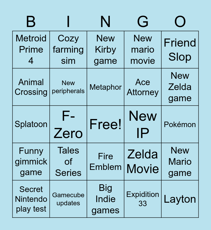 This bingo card has a free space and 24 words: Tales of Series, Gamecube updates, Metaphor, Secret Nintendo play test, Friend Slop, Metroid Prime 4, Animal Crossing, Cozy farming sim, New IP, Fire Emblem, Ace Attorney, Splatoon, Zelda Movie, New Mario game, New peripherals, Expidition 33, Pokémon, New Kirby game, New Zelda game, F-Zero, Layton, Funny gimmick game, New mario movie and Big Indie games.