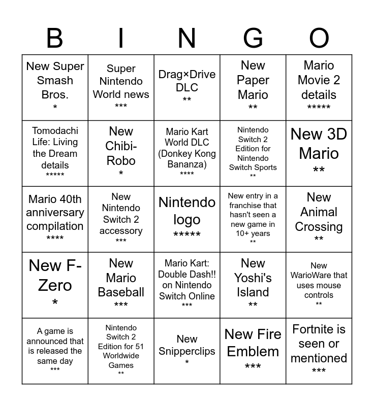 This bingo card has a free space and 24 words: New Mario Baseball ***, Nintendo Switch 2 Edition for 51 Worldwide Games **, Mario Kart World DLC (Donkey Kong Bananza) ****, A game is announced that is released the same day ***, Mario Movie 2 details *****, New Super Smash Bros. *, Tomodachi Life: Living the Dream details *****, Super Nintendo World news ***, New entry in a franchise that hasn't seen a new game in 10+ years **, Mario Kart: Double Dash!! on Nintendo Switch Online ***, Nintendo Switch 2 Edition for Nintendo Switch Sports **, Mario 40th anniversary compilation ****, New Yoshi's Island **, New WarioWare that uses mouse controls **, New Chibi-Robo *, New Fire Emblem ***, New Animal Crossing **, Drag×Drive DLC **, New 3D Mario **, New Nintendo Switch 2 accessory ***, Fortnite is seen or mentioned ***, New F-Zero *, New Paper Mario ** and New Snipperclips *.