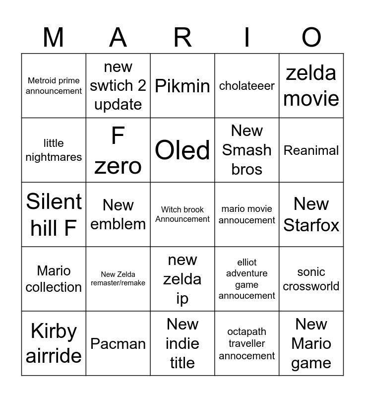 This bingo card has 25 words: New Zelda remaster/remake, New indie title, Oled, Kirby airride, zelda movie, Metroid prime announcement, little nightmares, new swtich 2 update, mario movie annoucement, new zelda ip, New Smash bros, Silent hill F, elliot adventure game annoucement, sonic crossworld, F zero, New Mario game, New Starfox, Pikmin, Reanimal, New emblem, Witch brook Announcement, Pacman, Mario collection, cholateeer and octapath traveller annocement.