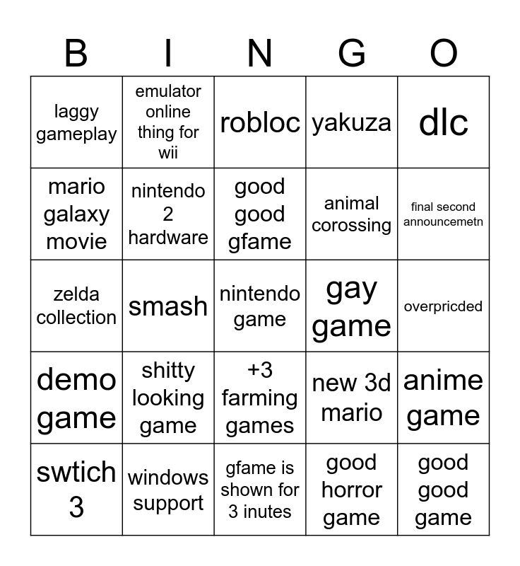 This bingo card has a free space and 24 words: shitty looking game, windows support, good good gfame, swtich 3, dlc, laggy gameplay, mario galaxy movie, emulator online thing for wii, gay game, +3 farming games, animal corossing, zelda collection, new 3d mario, anime game, nintendo 2 hardware, good horror game, overpricded, robloc, final second announcemetn, smash, good good game, demo game, yakuza and gfame is shown for 3 inutes.