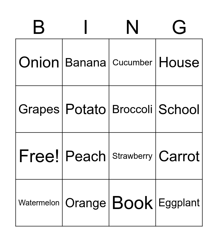 This bingo card has 20 words: Carrot, Apple, Cucumber, Tomato, Watermelon, Grapes, Orange, Onion, Free!, Banana, Peach, Strawberry, Potato, Eggplant, Broccoli, Mango, School, House, Book and Pencil.