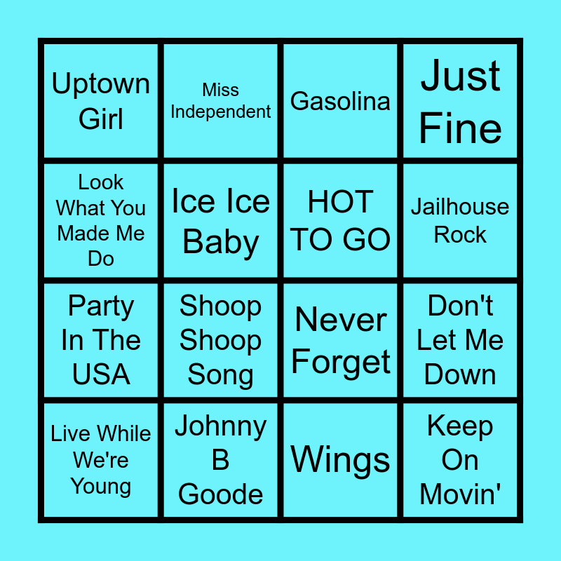 This bingo card has 62 words: Jump Around, Men In Black, Bye, Bye, Bye, Keep On Movin', Poker Face, Because Of You, HOT TO GO, Good 4 U, Party In The USA, Treasure, Just Fine, Thong Song, Ice Ice Baby, Shout, Come on Eileen, Uptown Girl, Live While We're Young, Look What You Made Me Do, Glad You Came, Jailhouse Rock, Johnny B Goode, Gasolina, Fireball, I Want To Break Free, Mr. Brightside, Chelsea dagger, 500 Miles, Is This The Way To Amarillo, Y.M.C.A., Von Dutch, All About The Bass, Roar, Bang Bang, Telephone, Wings, Miss Independent, Stargazing, Sorry, Don't Let Me Down, Wherever You Will Go, Never Forget, Rock DJ, We built this city, Twist And Shout, Shoop Shoop Song, 9 To 5, Ordinary, Call Me Maybe, So What, I'll Be There For You, I Wish I Was A Punk Rocker, My Life Would Suck Without You, Tequila, Blame It On The Boogie, Dakota, Do You Really Like It?, Fight for this love, All The Small Things, One Night In Heaven, Moves Like Jagger, When The Going Gets Tough and Gotta Get Thru This.