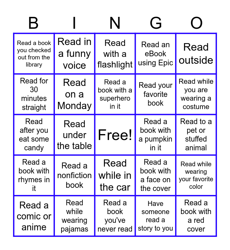 This bingo card has a free space and 24 words: Read a nonfiction book, Read while wearing pajamas, Read a book with a superhero in it, Read a comic or anime, Read outside, Read a book you checked out from the library, Read for 30 minutes straight, Read in a funny voice, Read a book with a pumpkin in it, Read while in the car, Read your favorite book, Read after you eat some candy, Read a book with a face on the cover, Read while wearing your favorite color, Read on a Monday, Have someone read a story to you, Read to a pet or stuffed animal, Read with a flashlight, Read while you are wearing a costume, Read under the table, Read a book with a red cover, Read a book with rhymes in it, Read an eBook using Epic and Read a book you've never read.