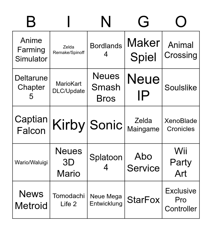 This bingo card has 25 words: Neues 3D Mario, Neue Mega Entwicklung, Neues Smash Bros, News Metroid, Animal Crossing, Anime Farming Simulator, Deltarune Chapter 5, Zelda Remake/Spinoff, Zelda Maingame, Splatoon 4, Neue IP, Captian Falcon, Abo Service, Wii Party Art, MarioKart DLC/Update, Exclusive Pro Controller, XenoBlade Cronicles, Bordlands 4, Soulslike, Kirby, Sonic, Tomodachi Life 2, Wario/Waluigi, Maker Spiel and StarFox.