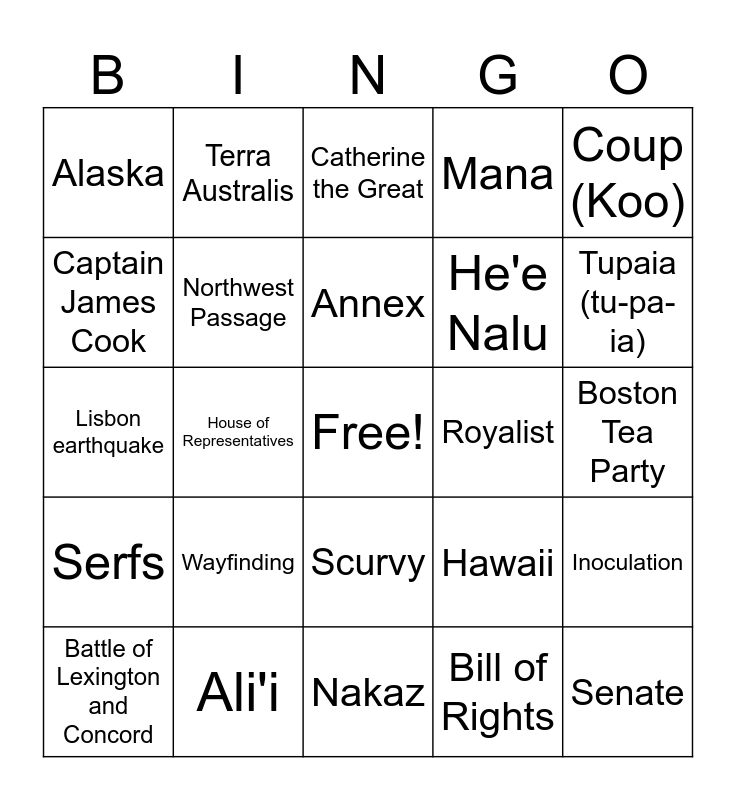 This bingo card has a free space and 24 words: Wayfinding, Ali'i, Annex, Battle of Lexington and Concord, Coup (Koo), Alaska, Captain James Cook, Terra Australis, Royalist, Scurvy, He'e Nalu, Lisbon earthquake, Hawaii, Inoculation, Northwest Passage, Bill of Rights, Boston Tea Party, Catherine the Great, Tupaia (tu-pa-ia), House of Representatives, Senate, Serfs, Mana and Nakaz.