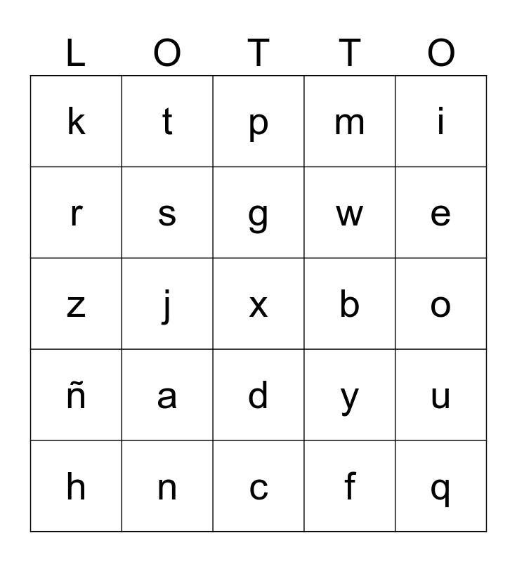This bingo card has 25 words: a, c, g, h, i, k, r, t, b, d, w, z, y, u, s, q, o, p, e, j, x, n, ñ, m and f.