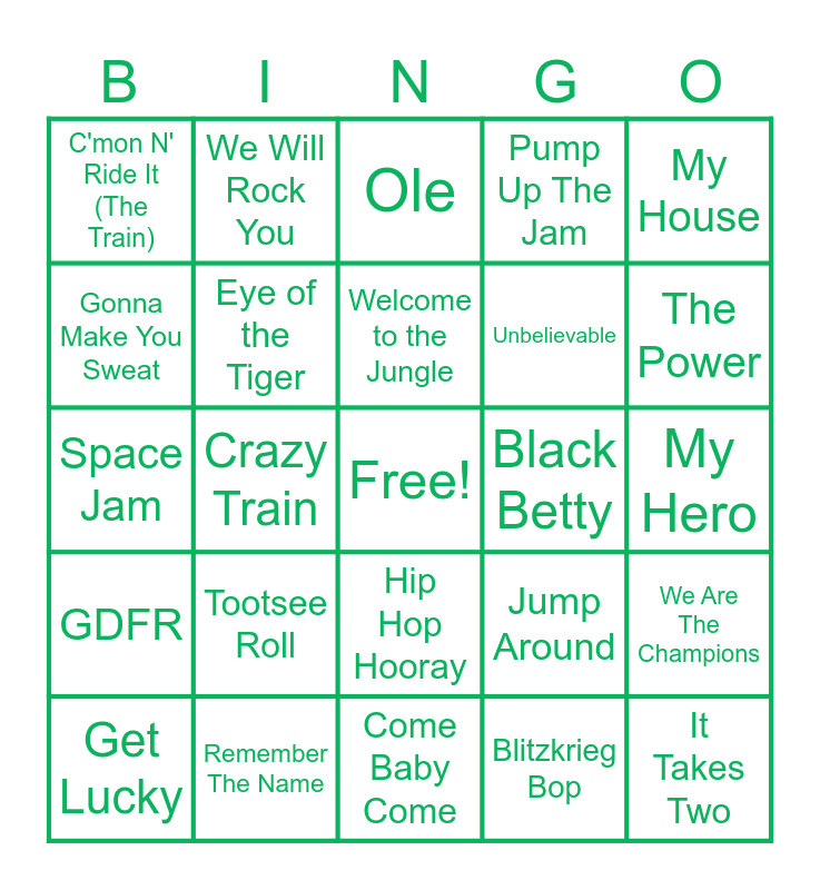 This bingo card has a free space and 47 words: Centerfield, It Takes Two, Rock And Roll Part 2, Come Baby Come, Tootsee Roll, Get Ready, We Will Rock You, Thunderstruck, Gonna Make You Sweat, Whoomp! (There It Is), Eye of the Tiger, Pump Up The Jam, We Are The Champions, Jump Around, Seven Nation Army, We Ready, Welcome to the Jungle, Black Betty, T.N.T., My House, Crazy Train, Blitzkrieg Bop, C'mon N' Ride It (The Train), Unbelievable, Boom Boom Boom, The Power, Get Lucky, Can't Hold Us, Hip Hop Hooray, GDFR, Gonna Fly Now, All I Do Is Win, Lose Yourself, Na Na Hey Hey Kiss Him Goodbye, Hit Me With Your Best Shot, Remember The Name, My Hero, Stronger, Gimme Three Steps, Walk This Way (ft. Aerosmith), Another One Bites The Dust, Ole, Space Jam, Mama Said Knock You Out, I Like to Move It, Ain't No Mountain High Enough and Higher.