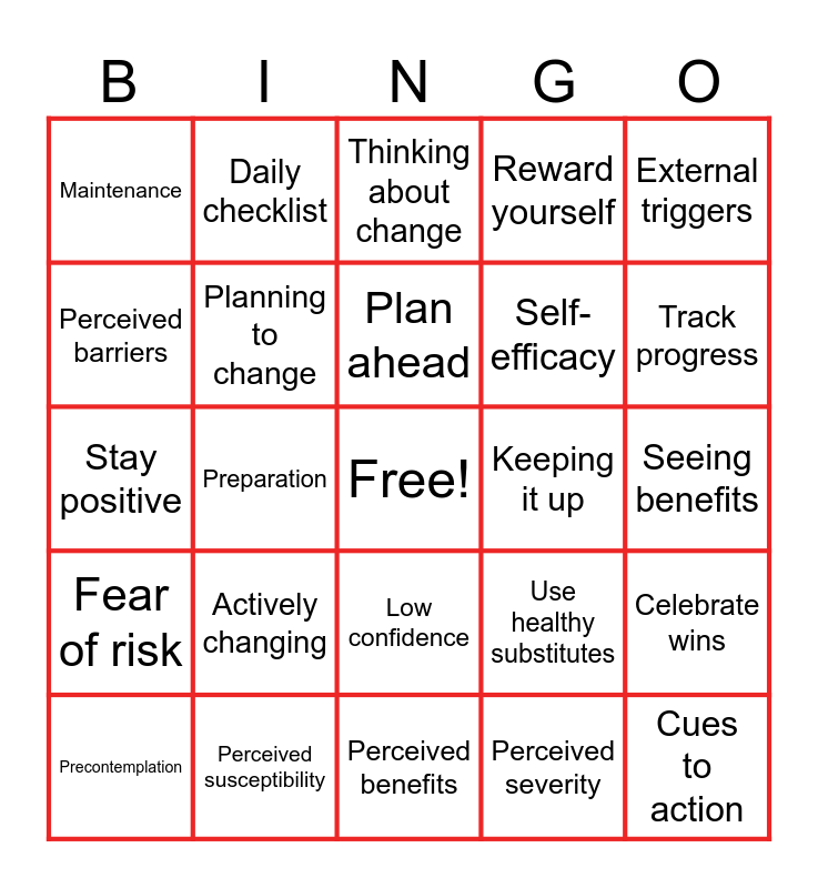 This bingo card has a free space and 29 words: Precontemplation, Contemplation, Preparation, Action, Maintenance, Thinking about change, Planning to change, Actively changing, Keeping it up, Perceived susceptibility, Seeing benefits, Cues to action, Perceived benefits, Perceived severity, Track progress, Use reminders, Low confidence, Fear of risk, External triggers, Stay positive, Use healthy substitutes, Ask for support, Self-efficacy, Perceived barriers, Reward yourself, Daily checklist, Celebrate wins, Plan ahead and Stay consistent.