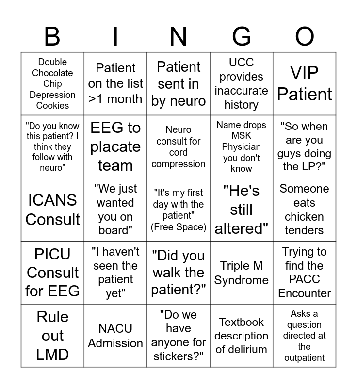 This bingo card has a free space and 24 words: "I haven't seen the patient yet", NACU Admission, Neuro consult for cord compression, Rule out LMD, VIP Patient, Double Chocolate Chip Depression Cookies, "Do you know this patient? I think they follow with neuro", Patient on the list >1 month, "He's still altered", "Did you walk the patient?", Name drops MSK Physician you don't know, ICANS Consult, Triple M Syndrome, Trying to find the PACC Encounter, EEG to placate team, Textbook description of delirium, Someone eats chicken tenders, Patient sent in by neuro, "So when are you guys doing the LP?", "We just wanted you on board", Asks a question directed at the outpatient, PICU Consult for EEG, UCC provides inaccurate history and "Do we have anyone for stickers?".
