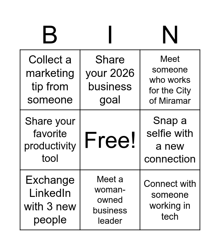 This bingo card has a free space and 8 words: Snap a selfie with a new connection, Meet someone who works for the City of Miramar, Share your 2026 business goal, Exchange LinkedIn with 3 new people, Collect a marketing tip from someone, Connect with someone working in tech, Share your favorite productivity tool and Meet a woman-owned business leader.