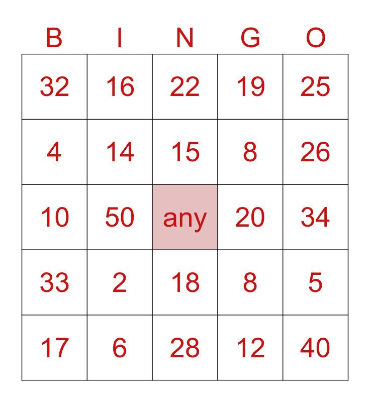 This bingo card has a free space and 24 words: 2, 6, 15, 17, 25, 32, 4, 16, 20, 18, 8, 10, 8, 5, 14, 12, 34, 22, 26, 50, 40, 33, 19 and 28.