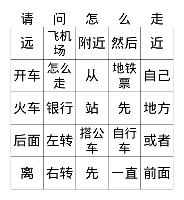 This bingo card has a free space and 24 words: 左转, 右转, 从, 离, 近, 远, 开车, 飞机场, 先, 搭公车, 地铁票, 火车, 自行车, 或者, 怎么走, 一直, 地方, 附近, 自己, 银行, 前面, 后面, 然后 and 先.