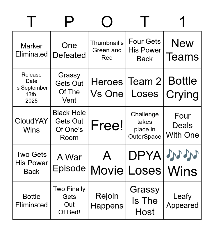This bingo card has a free space and 24 words: A War Episode, Two Finally Gets Out Of Bed!, Heroes Vs One, Bottle Eliminated, New Teams, Marker Eliminated, Release Date Is September 13th, 2025, One Defeated, Challenge takes place in OuterSpace, A Movie, Team 2 Loses, CloudYAY Wins, DPYA Loses, 🎶🎶 Wins, Grassy Gets Out Of The Vent, Grassy Is The Host, Four Deals With One, Thumbnail’s Green and Red, Bottle Crying, Black Hole Gets Out Of One’s Room, Leafy Appeared, Two Gets His Power Back, Four Gets His Power Back and Rejoin Happens.