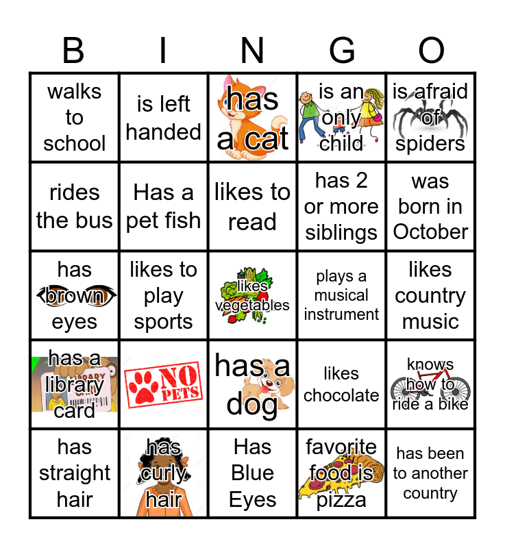 This bingo card has 11 images and 24 words: Has Blue Eyes, likes to read, has straight hair, is afraid of spiders, walks to school, rides the bus, is left handed, plays a musical instrument, has a dog, has 2 or more siblings, has brown eyes, likes chocolate, knows how to ride a bike, Has a pet fish, has been to another country, likes country music, has a cat, was born in October, likes to play sports, likes vegetables, has curly hair, has a library card, is an only child and favorite food is pizza.