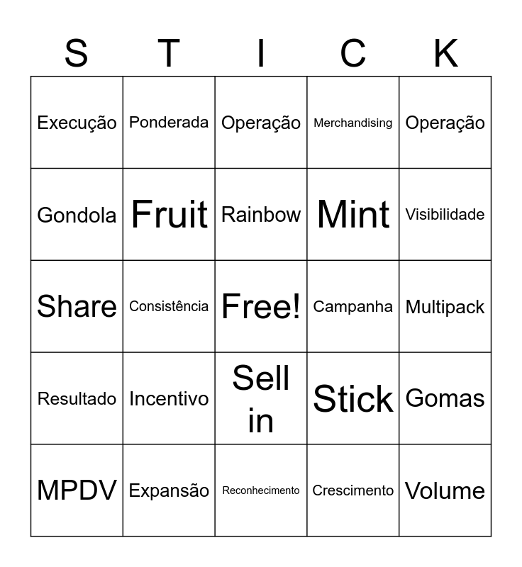 This bingo card has a free space and 33 words: Distribuição, Sell out, Sell in, Cobertura, Visibilidade, Execução, Consistência, Padronização, Merchandising, Check-out, Gondola, Ponderada, Meta, Crescimento, Operação, Share, Incentivo, Reconhecimento, Stick, Multipack, MPDV, Oportunidade, Operação, Campanha, Volume, Resultado, Fruit, Rainbow, Mint, Gomas, Wild, Expansão and SHOPPER.