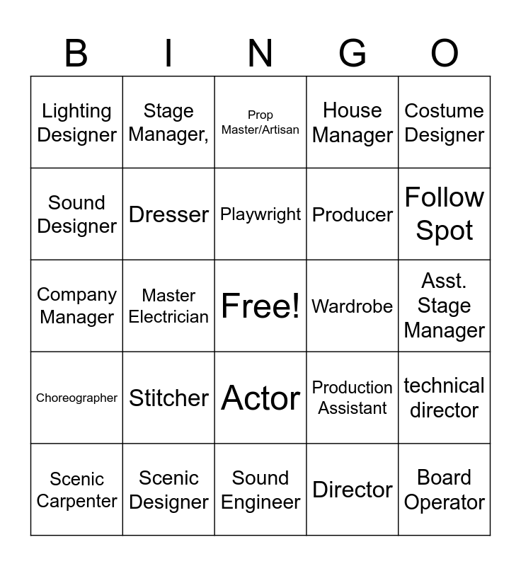 This bingo card has a free space and 26 words: Actor, Director, Playwright, Scenic Designer, Costume Designer, Lighting Designer, Sound Designer, Stage Manager,, Asst. Stage Manager, Production Assistant, Producer, Company Manager, technical director, Scenic Carpenter, Master Electrician, Box Office Manager, House Manager, Choreographer, Prop Master/Artisan, Board Operator, Follow Spot, Sound Engineer, Wardrobe, Stitcher, Dresser and Scenic Charge.