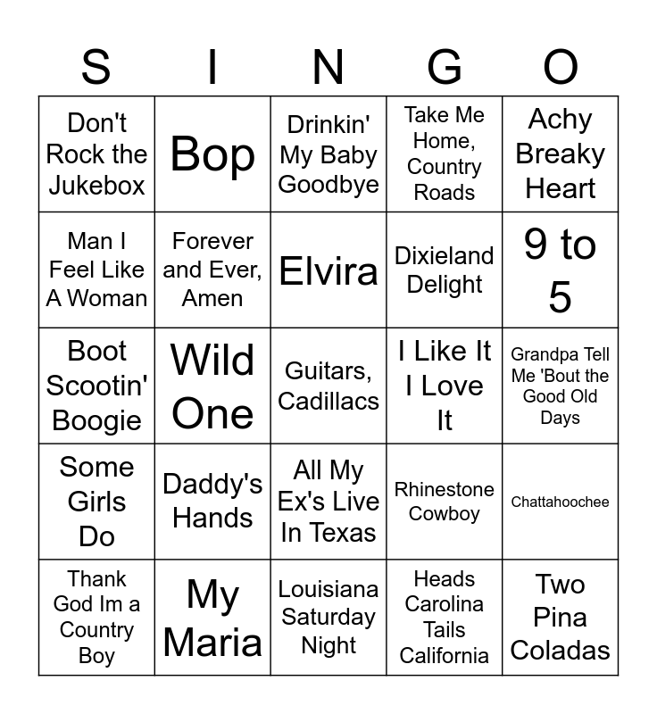 This bingo card has 35 words: If Your Gonna Play In Texas, Fishin' In The Dark, Song of the South, Forever and Ever, Amen, All My Ex's Live In Texas, Take Me Home, Country Roads, Man I Feel Like A Woman, I Love a Rainy Night, Elvira, Eighteen Wheels and a Dozen Roses, Boot Scootin' Boogie, Achy Breaky Heart, Little Bitty, If I Could Make a Living, Don't Rock the Jukebox, I Like It I Love It, Heads Carolina Tails California, Wild One, Some Girls Do, Guitars, Cadillacs, Rhinestone Cowboy, Thank God Im a Country Boy, Chattahoochee, My Maria, Drinkin' My Baby Goodbye, 9 to 5, Two Pina Coladas, A Good Hearted Woman, Dixieland Delight, Grandpa Tell Me 'Bout the Good Old Days, I'm A Ramblin Man, Louisiana Saturday Night, Daddy's Hands, Bop and Islands In The Stream.