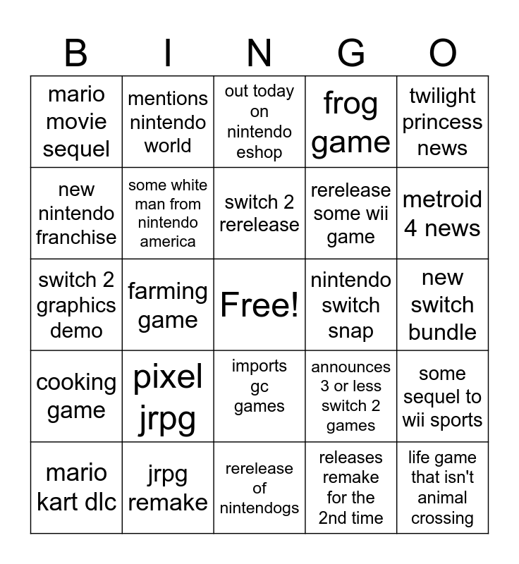 This bingo card has a free space and 24 words: pixel jrpg, jrpg remake, switch 2 rerelease, mario kart dlc, twilight princess news, mario movie sequel, new nintendo franchise, mentions nintendo world, nintendo switch snap, imports gc games, rerelease some wii game, switch 2 graphics demo, announces 3 or less switch 2 games, some sequel to wii sports, some white man from nintendo america, releases remake for the 2nd time, new switch bundle, out today on nintendo eshop, metroid 4 news, farming game, life game that isn't animal crossing, cooking game, frog game and rerelease of nintendogs.