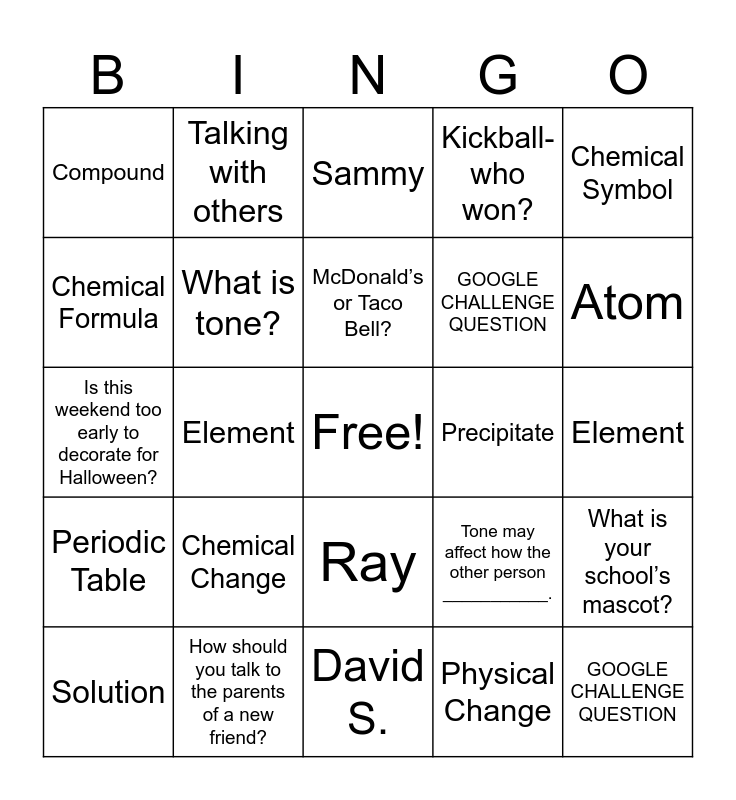 This bingo card has a free space and 29 words: Solution, Jayden, Element, Dissolve, Compound, Sammy, What is tone?, Chemical Change, Precipitate, How should you talk to the parents of a new friend?, Element, GOOGLE CHALLENGE QUESTION, David S., Physical Change, Atom, Why is tone important?, Ray, Periodic Table, Chemical Symbol, Is this weekend too early to decorate for Halloween?, Tone may affect how the other person ___________., What is an appropriate greeting when you are greeting your new teacher?, GOOGLE CHALLENGE QUESTION, Chemical Formula, Kickball-who won?, Talking with others, What is your school’s mascot?, McDonald’s or Taco Bell? and What is something that you would LOVE to buy for someone else if money were no problem?.