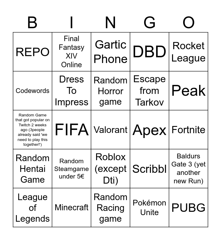 This bingo card has a free space and 24 words: Random Steamgame under 5€, Minecraft, Random Horror game, League of Legends, Rocket League, REPO, Codewords, Final Fantasy XIV Online, Apex, Roblox (except Dti), Escape from Tarkov, Random Game that got popular on Twitch 2 weeks ago (3people already said 'we need to play this together!'), Scribbl, Baldurs Gate 3 (yet another new Run), Dress To Impress, Pokémon Unite, Fortnite, Gartic Phone, Peak, FIFA, PUBG, Random Hentai Game, DBD and Random Racing game.
