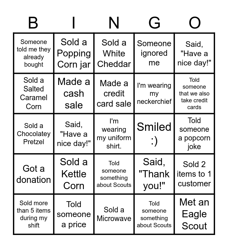 This bingo card has a free space and 24 words: Sold a Kettle Corn, Told someone a price, Made a credit card sale, Sold more than 5 items during my shift, Said, "Have a nice day!", Someone told me they already bought, Sold a Salted Caramel Corn, Sold a Popping Corn jar, Smiled :), Told someone something about Scouts, I'm wearing my neckerchief, Sold a Chocolatey Pretzel, Said, "Thank you!", Sold 2 items to 1 customer, Made a cash sale, Told someone something about Scouts, Told someone a popcorn joke, Sold a White Cheddar, Told someone that we also take credit cards, Said, "Have a nice day!", Met an Eagle Scout, Got a donation, Someone ignored me and Sold a Microwave.
