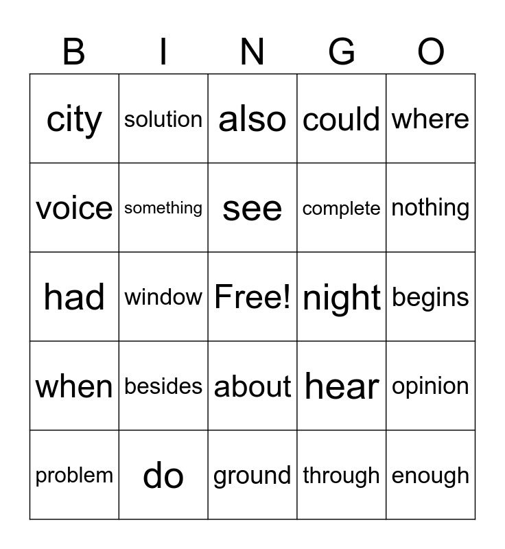 This bingo card has a free space and 31 words: ground, thought, window, leave, city, also, something, hear, night, through, begins, enough, party, places, nothing, everything, opinion, besides, when, about, where, were, problem, solution, complete, voice, could, had, do, see and not.