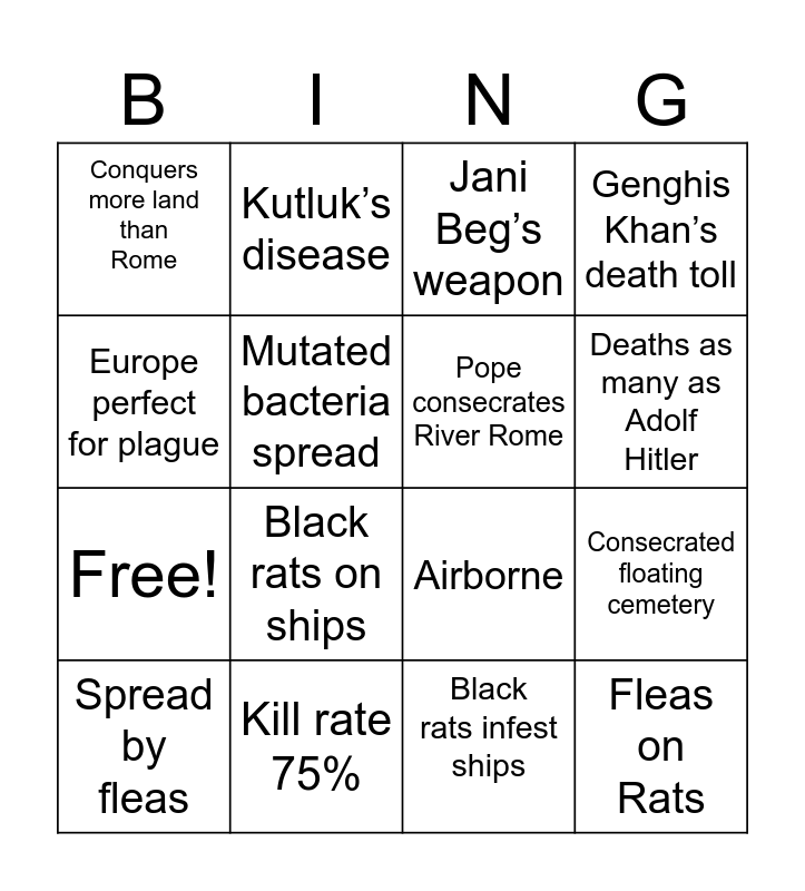 This bingo card has 20 words: Consecrated floating cemetery, Key to Mongol success, Jani Beg’s weapon, Travels along trading routes, Spread by fleas, Europe perfect for plague, Kill rate 75%, Conquers more land than Rome, Free!, Kutluk’s disease, Black rats on ships, Airborne, Mutated bacteria spread, Fleas on Rats, Pope consecrates River Rome, 4.5 million sq miles conquered, Deaths as many as Adolf Hitler, Genghis Khan’s death toll, Black rats infest ships and Mongol warriors' eat on horseback.