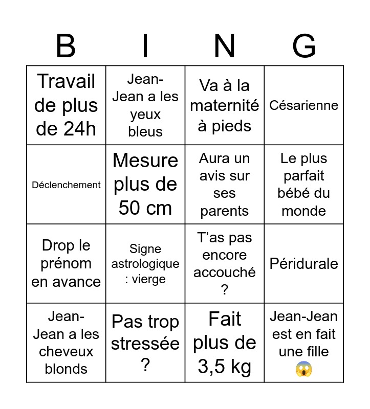 This bingo card has 16 words: Pas trop stressée ?, Péridurale, Va à la maternité à pieds, Travail de plus de 24h, Drop le prénom en avance, Jean-Jean a les yeux bleus, T’as pas encore accouché ?, Fait plus de 3,5 kg, Déclenchement, Mesure plus de 50 cm, Jean-Jean a les cheveux blonds, Césarienne, Signe astrologique : vierge, Le plus parfait bébé du monde, Aura un avis sur ses parents and Jean-Jean est en fait une fille 😱.