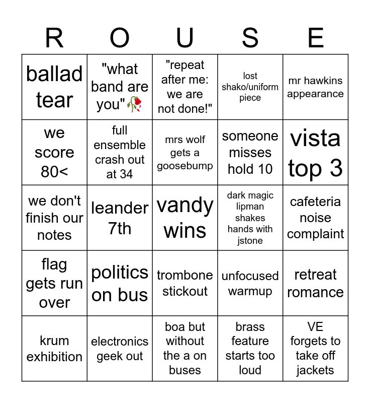 This bingo card has a free space and 24 words: politics on bus, electronics geek out, mrs wolf gets a goosebump, krum exhibition, mr hawkins appearance, ballad tear, we score 80<, "what band are you"🥀, dark magic lipman shakes hands with jstone, trombone stickout, someone misses hold 10, we don't finish our notes, unfocused warmup, retreat romance, full ensemble crash out at 34, brass feature starts too loud, cafeteria noise complaint, "repeat after me: we are not done!", vista top 3, leander 7th, VE forgets to take off jackets, flag gets run over, lost shako/uniform piece and boa but without the a on buses.