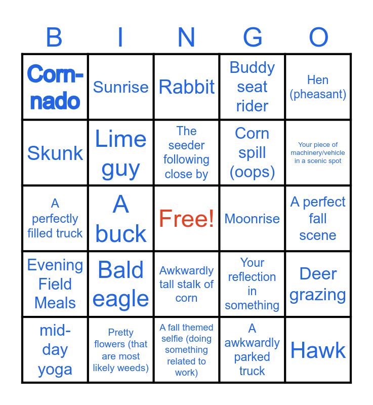 This bingo card has a free space and 24 words: Bald eagle, Pretty flowers (that are most likely weeds), The seeder following close by, mid-day yoga, Hen (pheasant), Corn-nado, Skunk, Sunrise, Moonrise, Awkwardly tall stalk of corn, Corn spill (oops), A perfectly filled truck, Your reflection in something, Deer grazing, Lime guy, A awkwardly parked truck, A perfect fall scene, Rabbit, Your piece of machinery/vehicle in a scenic spot, A buck, Hawk, Evening Field Meals, Buddy seat rider and A fall themed selfie (doing something related to work).