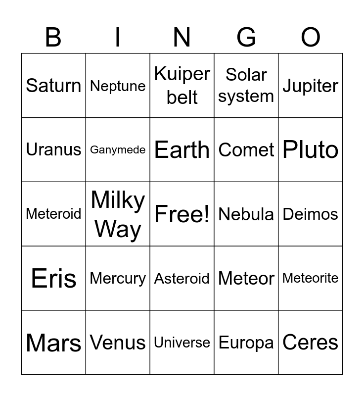 This bingo card has a free space and 24 words: Mercury, Venus, Earth, Mars, Jupiter, Saturn, Uranus, Neptune, Nebula, Asteroid, Comet, Meteroid, Meteor, Meteorite, Ganymede, Europa, Deimos, Kuiper belt, Pluto, Milky Way, Ceres, Eris, Solar system and Universe.