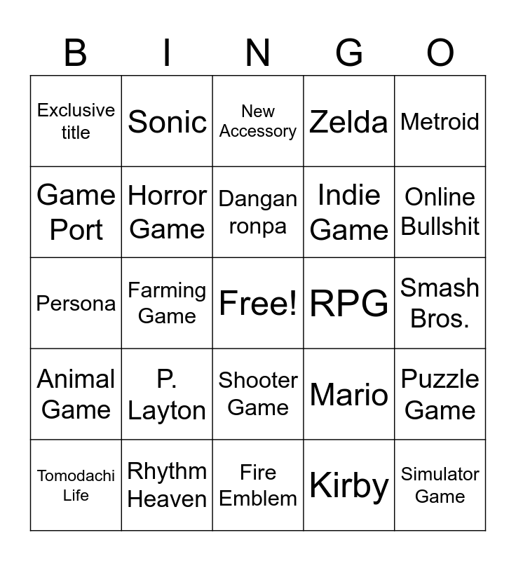 This bingo card has a free space and 24 words: P. Layton, Rhythm Heaven, Dangan ronpa, Tomodachi Life, Metroid, Exclusive title, Game Port, Sonic, RPG, Shooter Game, Indie Game, Persona, Mario, Puzzle Game, Horror Game, Kirby, Smash Bros., New Accessory, Online Bullshit, Farming Game, Simulator Game, Animal Game, Zelda and Fire Emblem.